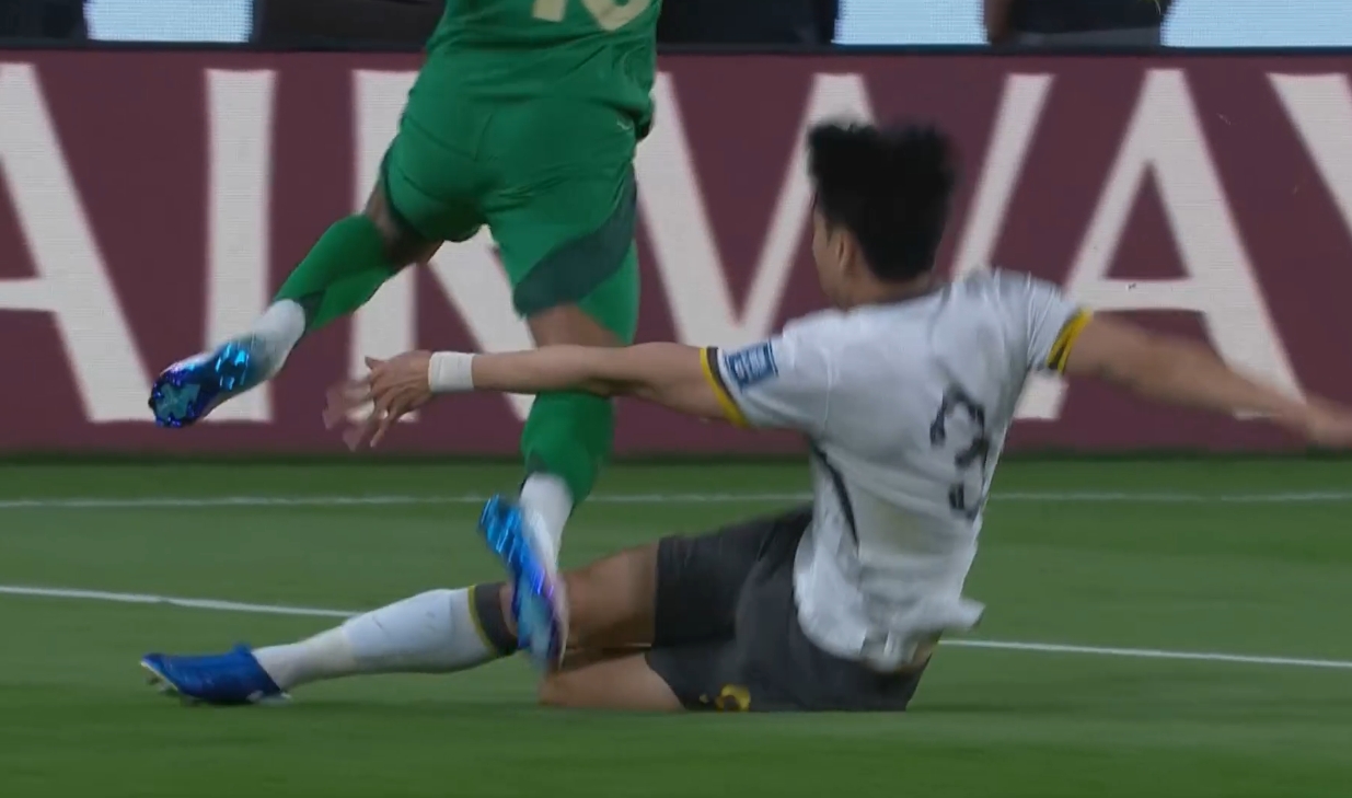 03月21日訊 國(guó)足vs沙特第14分鐘,高準(zhǔn)翼邊路鏟倒對(duì)手,裁判吹罰犯規(guī)不過沒有出牌。