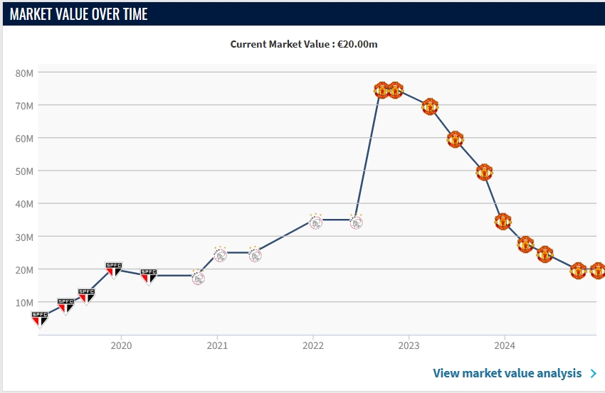 本賽季25歲的安東尼自曼聯(lián)租借至皇家貝蒂斯后狀態(tài)火熱,為皇家貝蒂斯出場11場已打入4球,并有4次助攻,且多為關(guān)鍵進球,幫助皇家貝蒂斯近期斬獲西甲五連勝??伤纳韮r卻與去年12月份相同,仍為2000萬歐元。