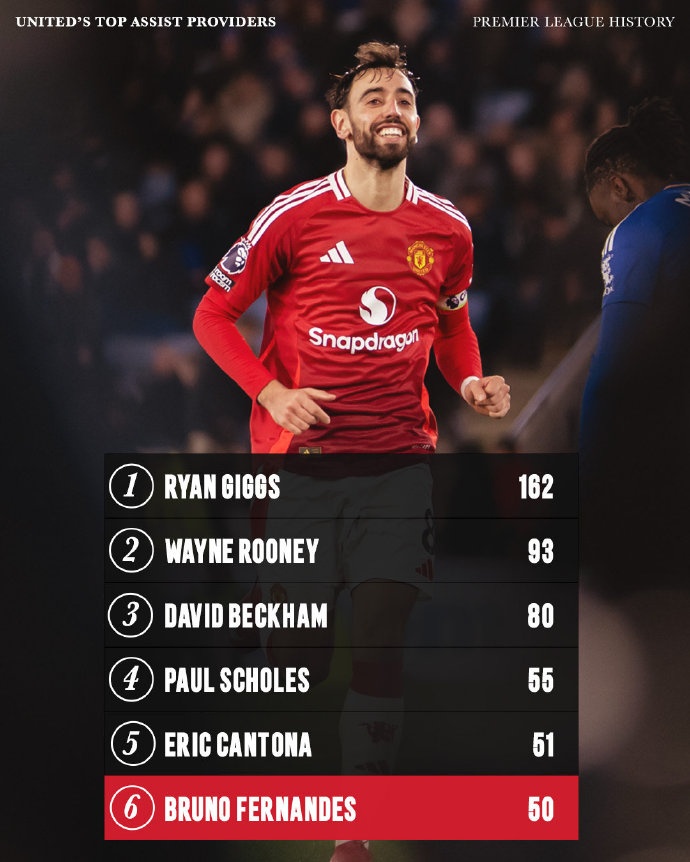 曼聯(lián)隊(duì)內(nèi)英超歷史助攻榜:吉格斯162次助攻斷層第一,B費(fèi)50次第六