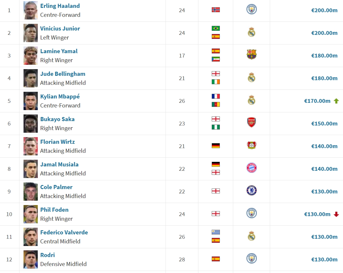 合理嗎?世界前十身價(jià):哈蘭德&維尼修斯2億第1,福登1.3億仍前10