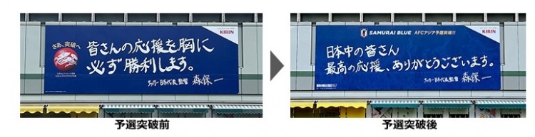 據(jù)日本足協(xié)報(bào)道,在日均人流量達(dá)300萬(wàn)的日本新宿地鐵站南面出口的一處看板上,在世預(yù)賽前后都換上了森保一親筆寫下的感謝語(yǔ)。據(jù)悉,自3月16日到鎖定世界杯參賽資格前,看板內(nèi)容為:“我們會(huì)將大家的聲援銘記在心,與巴林一戰(zhàn)我們一定會(huì)取勝。”