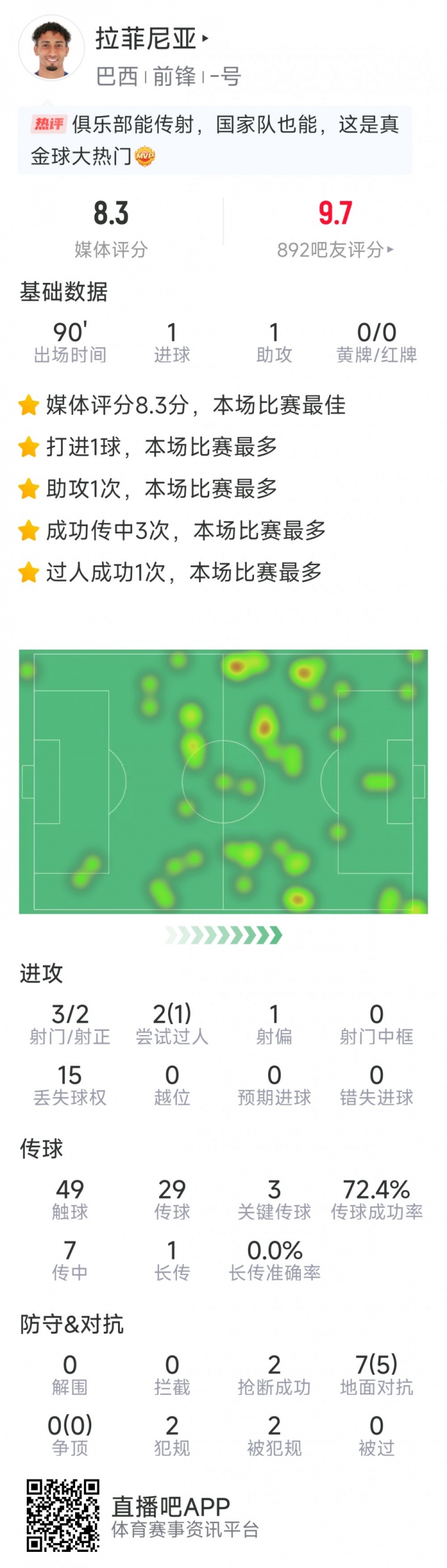 拉菲尼亞本場數(shù)據(jù):傳射建功,3次關(guān)鍵傳球,3射2正,2次搶斷