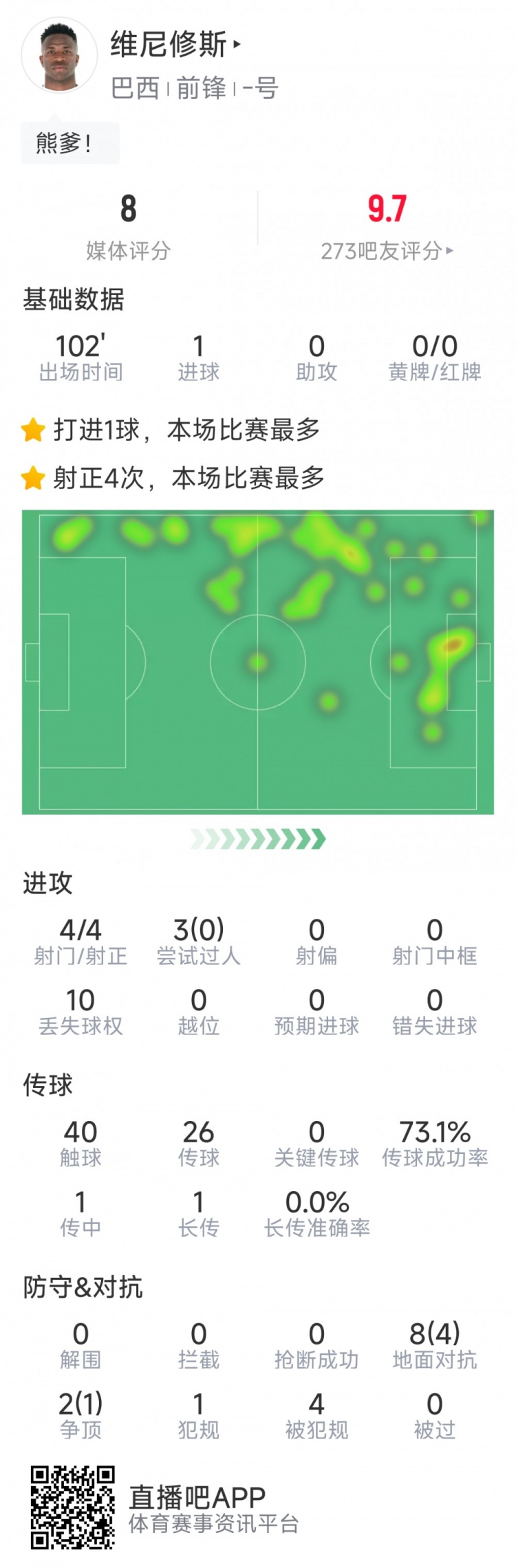 維尼修斯本場數(shù)據(jù):打進絕殺,4次射門均射正,5次成功對抗