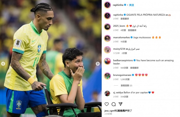 拉菲尼亞也通過社媒曬出自己賽前為殘障球迷手推輪椅的照片,并配文:“他們?cè)谛撵`層面是巨人?!?/p>