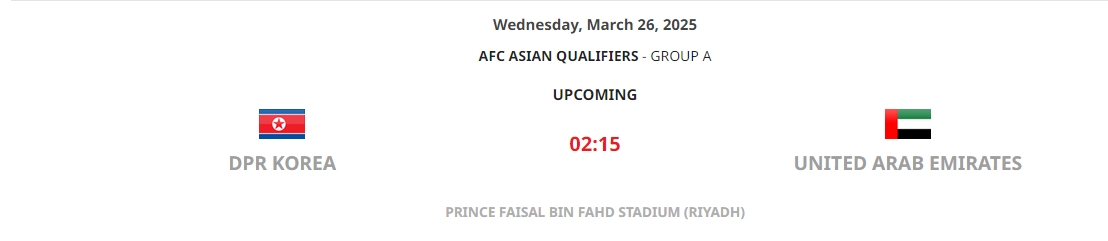 亞足聯(lián)官網(wǎng)顯示:朝鮮主場對陣阿聯(lián)酋的比賽,將在沙特利雅得進(jìn)行