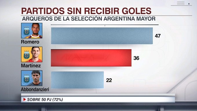統(tǒng)計(jì)表明,馬丁內(nèi)斯已經(jīng)36次為阿根廷零封對(duì)手,排名第二,僅次47次的羅梅羅。
