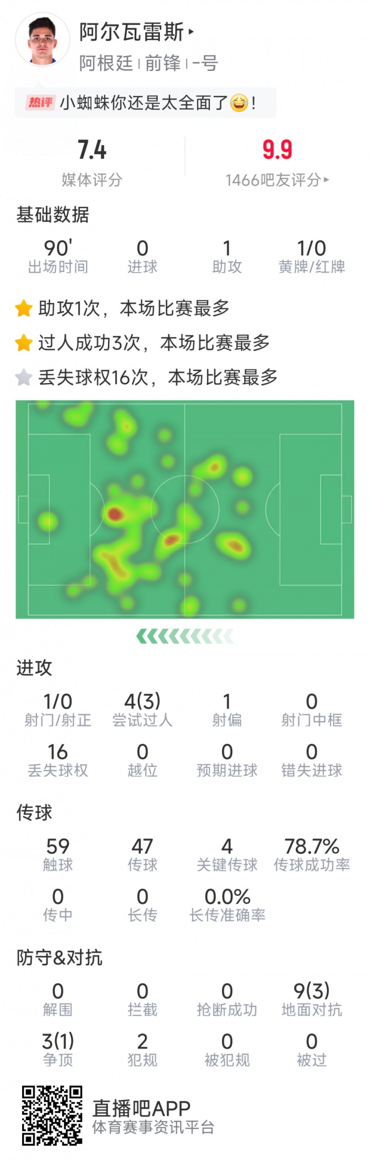 阿爾瓦雷斯本場數(shù)據(jù):1次助攻,4次關(guān)鍵傳球,3次成功過人