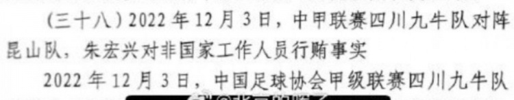 2022年12月3日,中甲聯(lián)賽四川九牛隊對陣昆山隊,朱宏興對非國家工作人員行賄事實。
