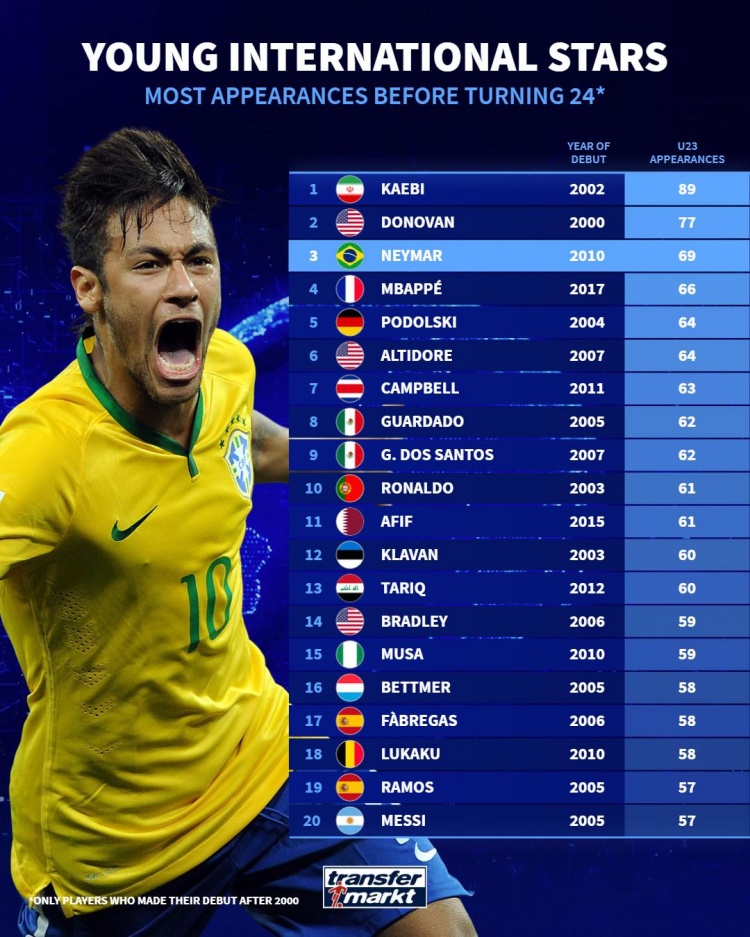 24歲之前國(guó)家隊(duì)出場(chǎng)排名(僅統(tǒng)計(jì)2000年后首秀球員)