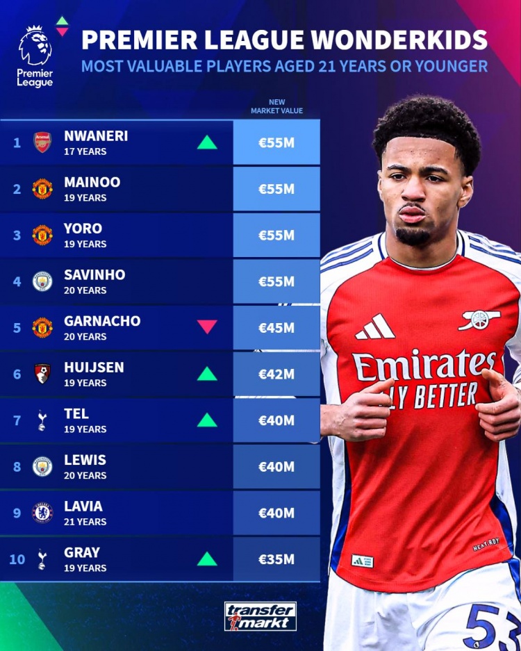 3月19日訊 德國轉(zhuǎn)會(huì)市場更新了英超U21球員的最新身價(jià),并列出身價(jià)榜單,恩瓦內(nèi)里、梅努、約羅、薩維尼奧5500萬歐并列居首。