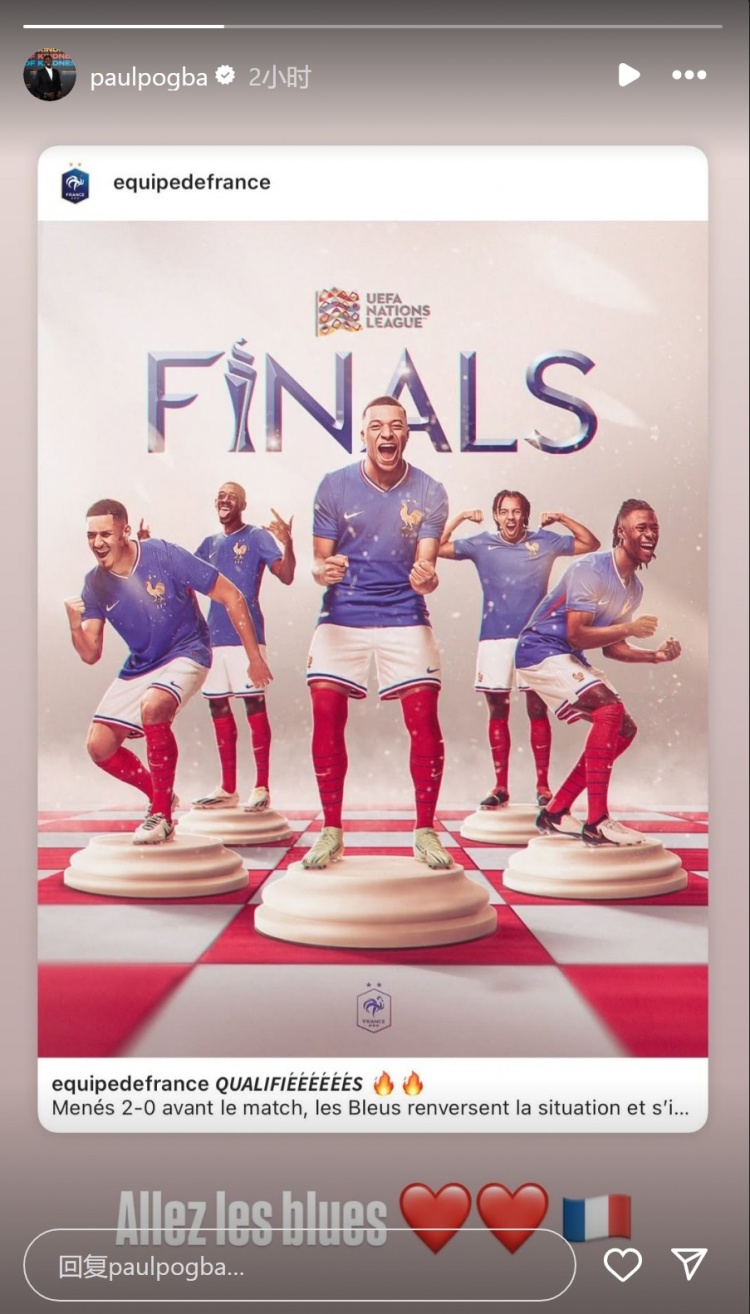博格巴更新社媒動態(tài),曬出法國隊的海報,祝賀球隊晉級,配文:“加油藍衣軍團!”