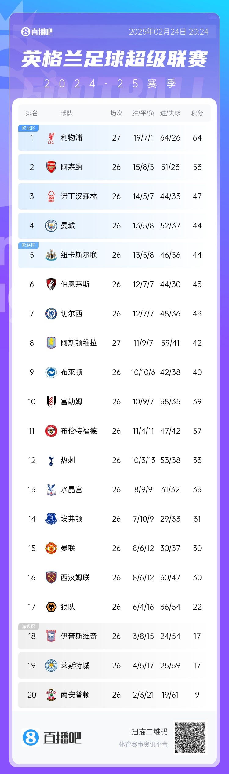 2月24日訊 在本輪英超,阿森納0-1不敵西漢姆,與榜首利物浦的差距已經(jīng)來到11分(少賽一場)。