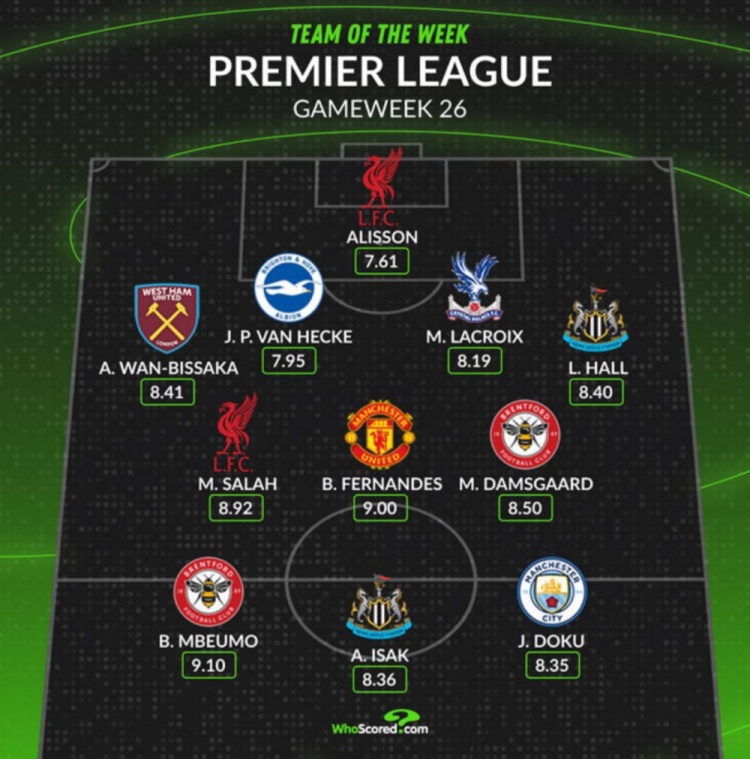 2月24日訊 本輪英超戰(zhàn)罷,數(shù)據(jù)網(wǎng)站W(wǎng)hoscored盤點(diǎn)了本輪英超最佳陣容,其中薩拉赫、B費(fèi)等在列,以下為具體陣容: