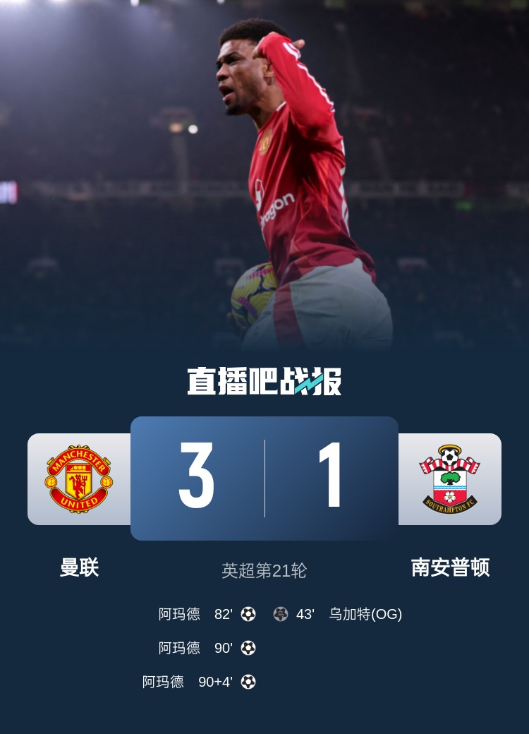 英超第21輪,南安普頓一直到81分鐘還保持1-0領(lǐng)先,隨后阿瑪?shù)逻B進(jìn)三球逆轉(zhuǎn)比賽。