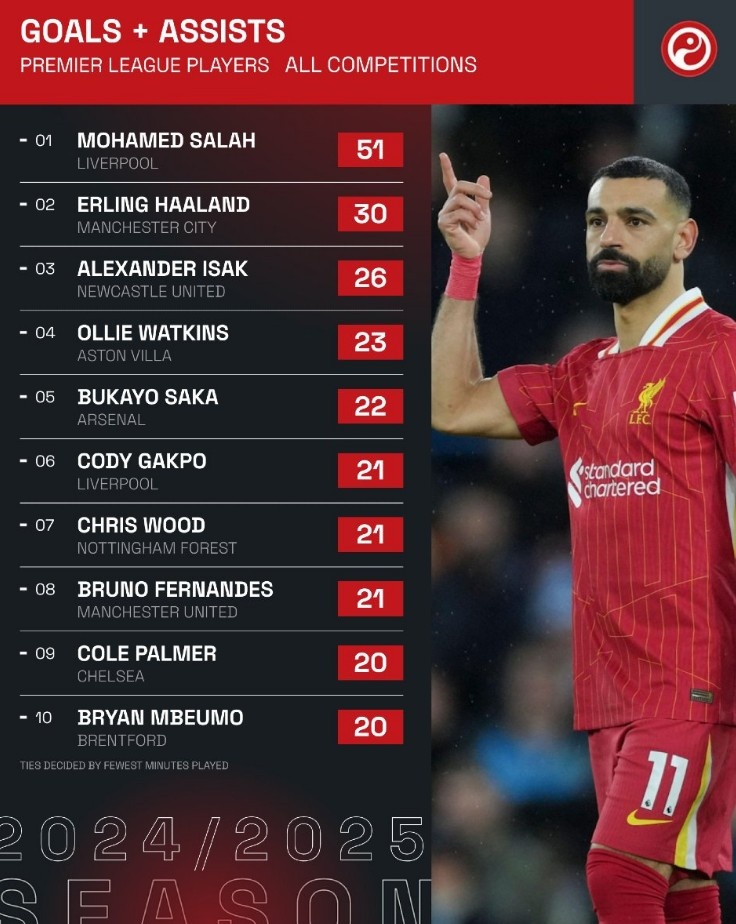 本賽季英超球員各項(xiàng)賽事參與進(jìn)球榜:薩拉赫51球居首,哈蘭德次席
