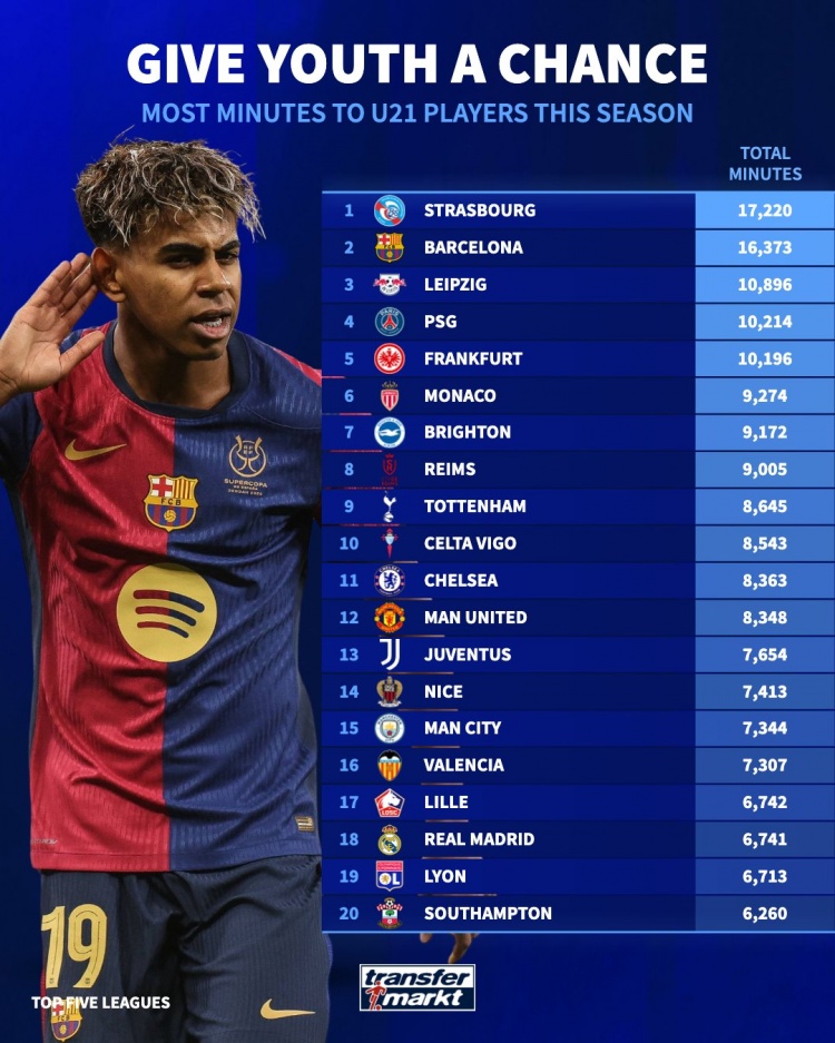 本賽季五大聯(lián)賽球隊(duì)U21球員出場(chǎng)時(shí)間排行榜↓(單位:分鐘)