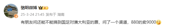 駱明表示:有朋友問還能不能搞到國足對澳大利亞的票,問了一個渠道,880的賣9000[饞嘴] ???