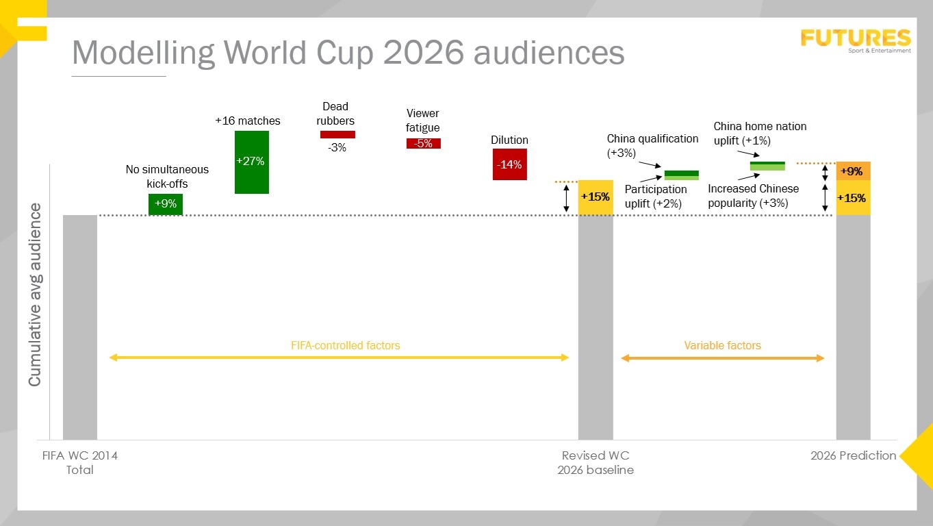 我們對(duì)16支擴(kuò)軍球隊(duì)進(jìn)行了推測(cè)。主要受益者將是亞洲和非洲國(guó)家;這兩個(gè)大洲足聯(lián)在2026年可能各自擁有9支代表隊(duì)(相比2014年分別僅有4支和5支)。在此條件下參加世界杯賽事,預(yù)計(jì)可使相關(guān)市場(chǎng)的收視率提升約20%,其中可能包括一些未參加過(guò)2014年巴西世界杯的人口大國(guó),如埃及(非洲足聯(lián))和土耳其(歐洲足聯(lián))。然而,迄今為止對(duì)全球收視率影響最大的變量將是中國(guó)是否晉級(jí)。中國(guó)晉級(jí)帶來(lái)的收視提升效應(yīng),將超過(guò)其余任何15支新晉球隊(duì)組合的總和。15支球隊(duì)的市場(chǎng)僅使我們預(yù)測(cè)的2026年總收視率增長(zhǎng)2%,而單單中國(guó)晉級(jí)即可帶來(lái)額外3%的增長(zhǎng)。