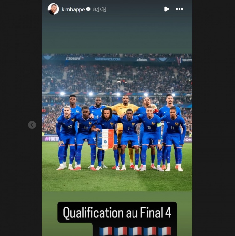 重返法國隊的姆巴佩在賽后通過社媒曬出全隊合照,并配文:“晉級四強!”