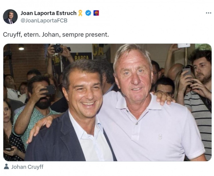 克魯伊夫逝世九周年,拉波爾塔社媒曬合照悼念:永恒不朽