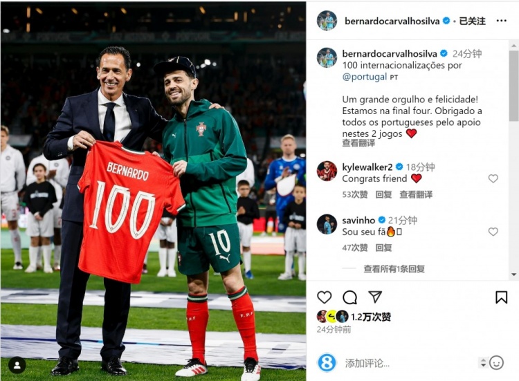 此役是B席為葡萄牙隊出戰(zhàn)的第100場比賽,因此獲贈紀(jì)念球衣。他在社交媒體上曬出照片,并寫道:“為葡萄牙國家隊出戰(zhàn)100場比賽,我感到非常自豪和高興!我們進(jìn)入了四強(qiáng),感謝所有葡萄牙球迷在兩回合比賽中的支持?!?/p>