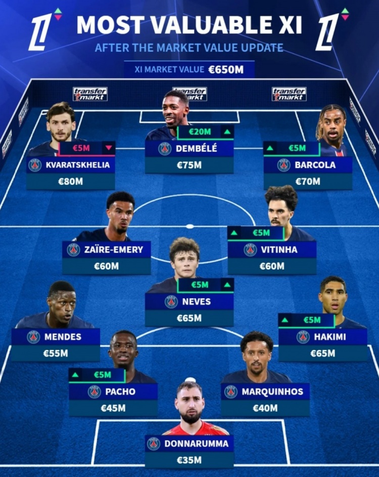 前鋒:克瓦拉茨赫利亞(8000萬歐,下降500萬歐)、登貝萊(7500萬歐,上漲2000萬歐)、巴爾科拉(7000萬歐,上漲500萬歐)