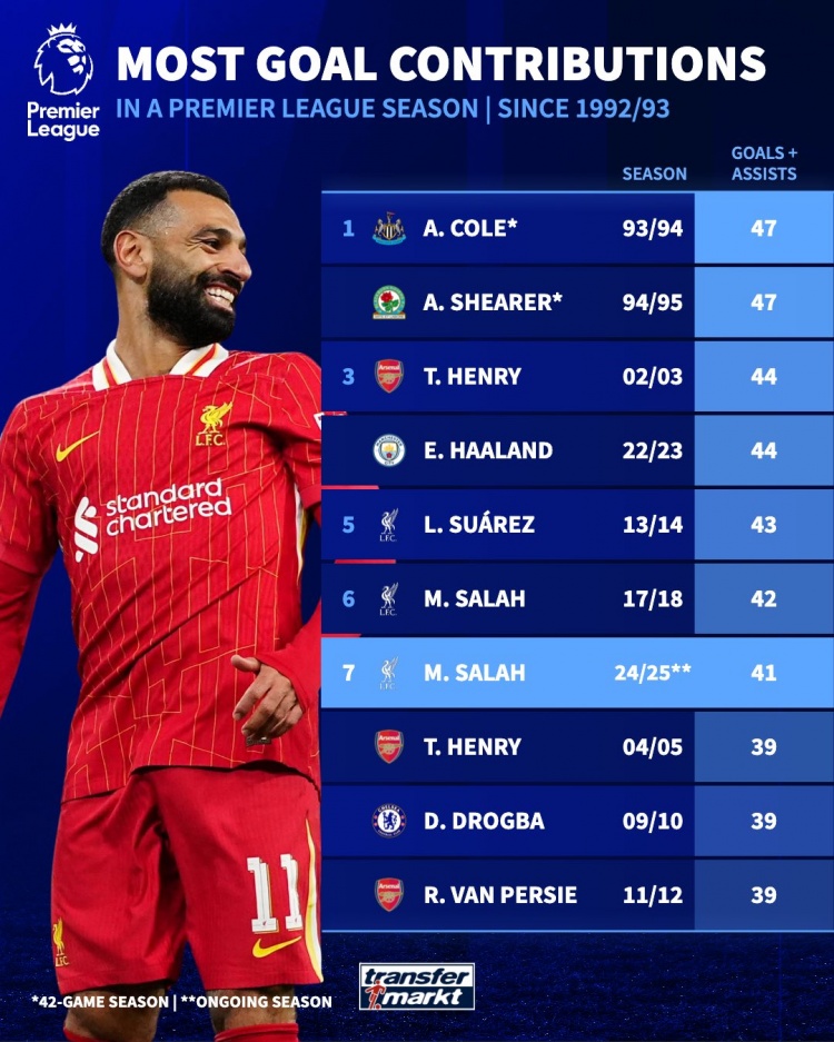 7、薩拉赫——41(2024-25賽季,賽季未結束)