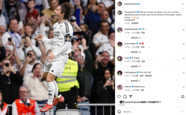 賽后莫德里奇也在個(gè)人社媒曬出慶祝進(jìn)球的照片,配文寫(xiě)道:“非常高興能夠幫助球隊(duì)全取三分,也感謝球迷們?cè)诓{烏球場(chǎng)營(yíng)造出的熱烈氛圍,讓我們一同前進(jìn)!”