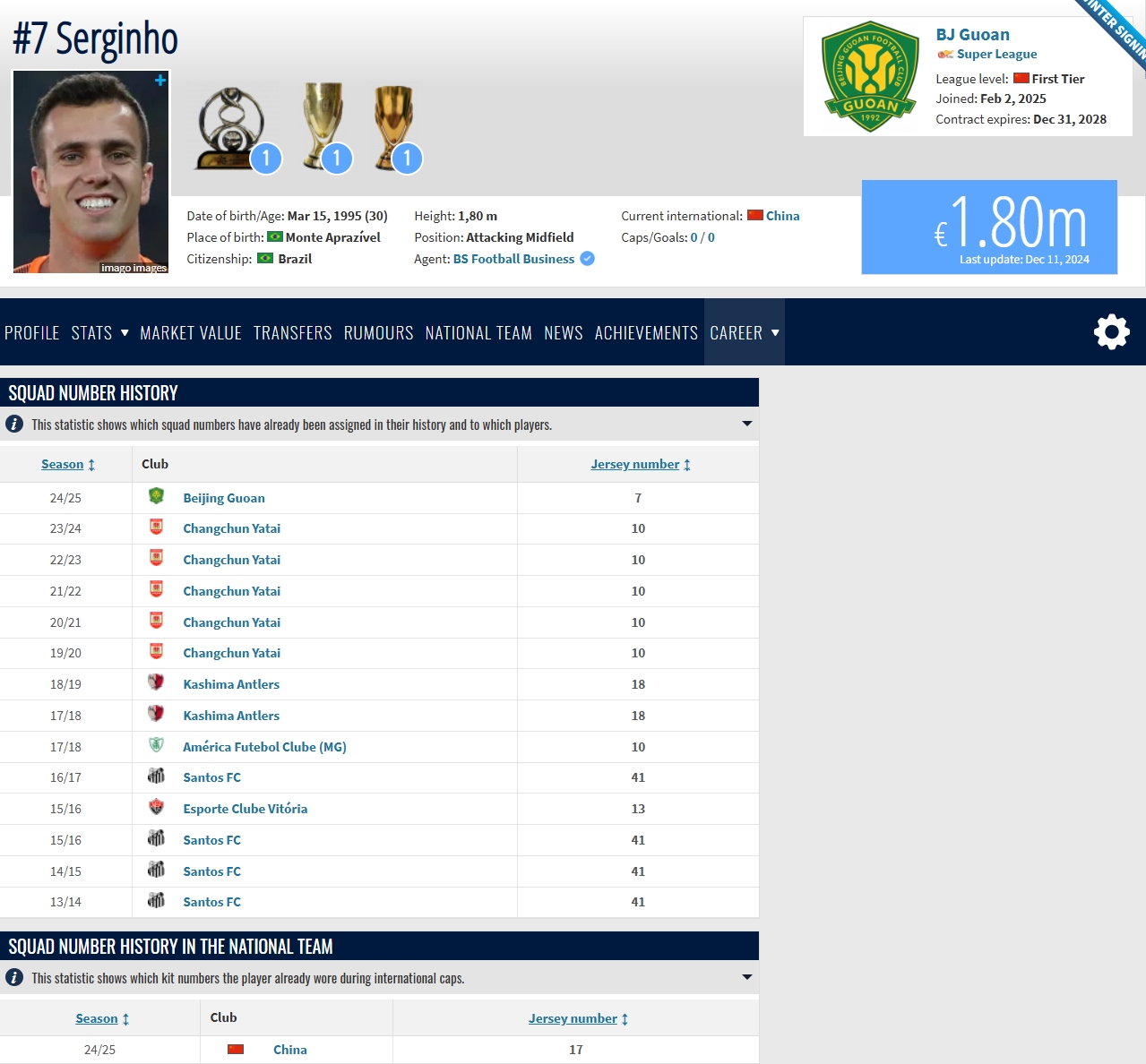 如果順利出場,這將是塞爾吉尼奧生涯首次穿上6號球衣比賽,此前他在中超長春亞泰打拼的5個賽季都是身穿象征進攻核心的10號球衣。