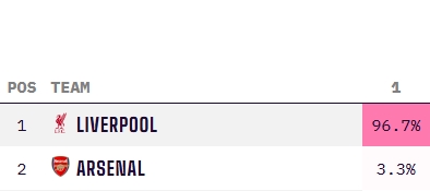 穩(wěn)了??利物浦最新英超奪冠概率高達96.7%,阿森納3.3% 曼城歸0