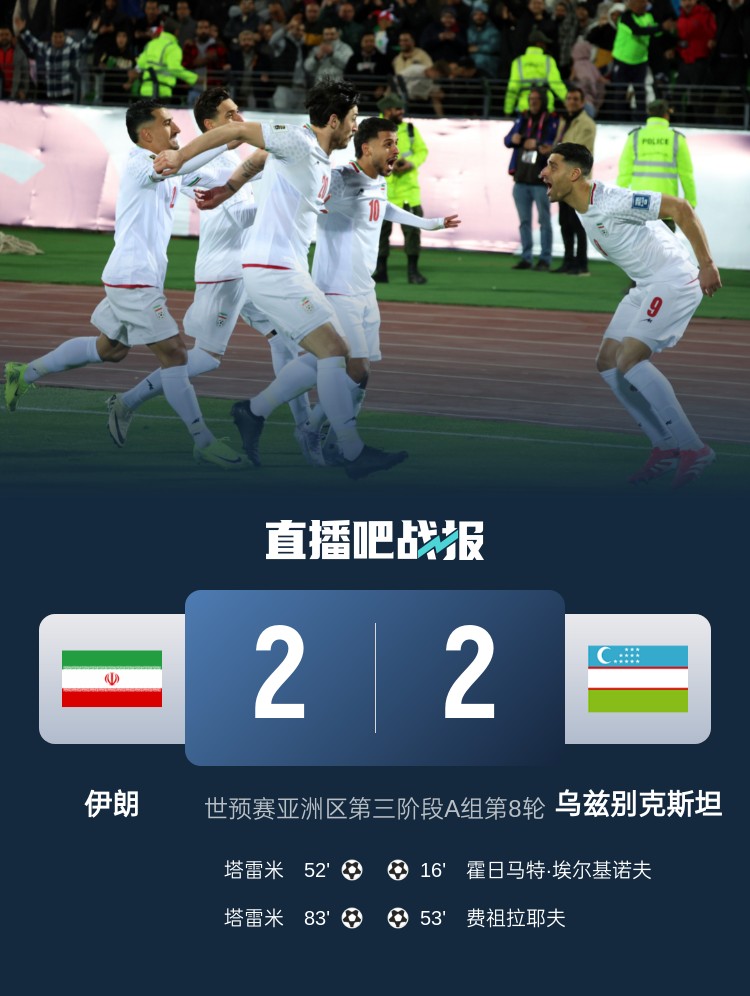 伊朗2-2戰(zhàn)平烏茲別克斯坦,伊朗提前鎖定直通世界杯!本場塔雷米雙響。