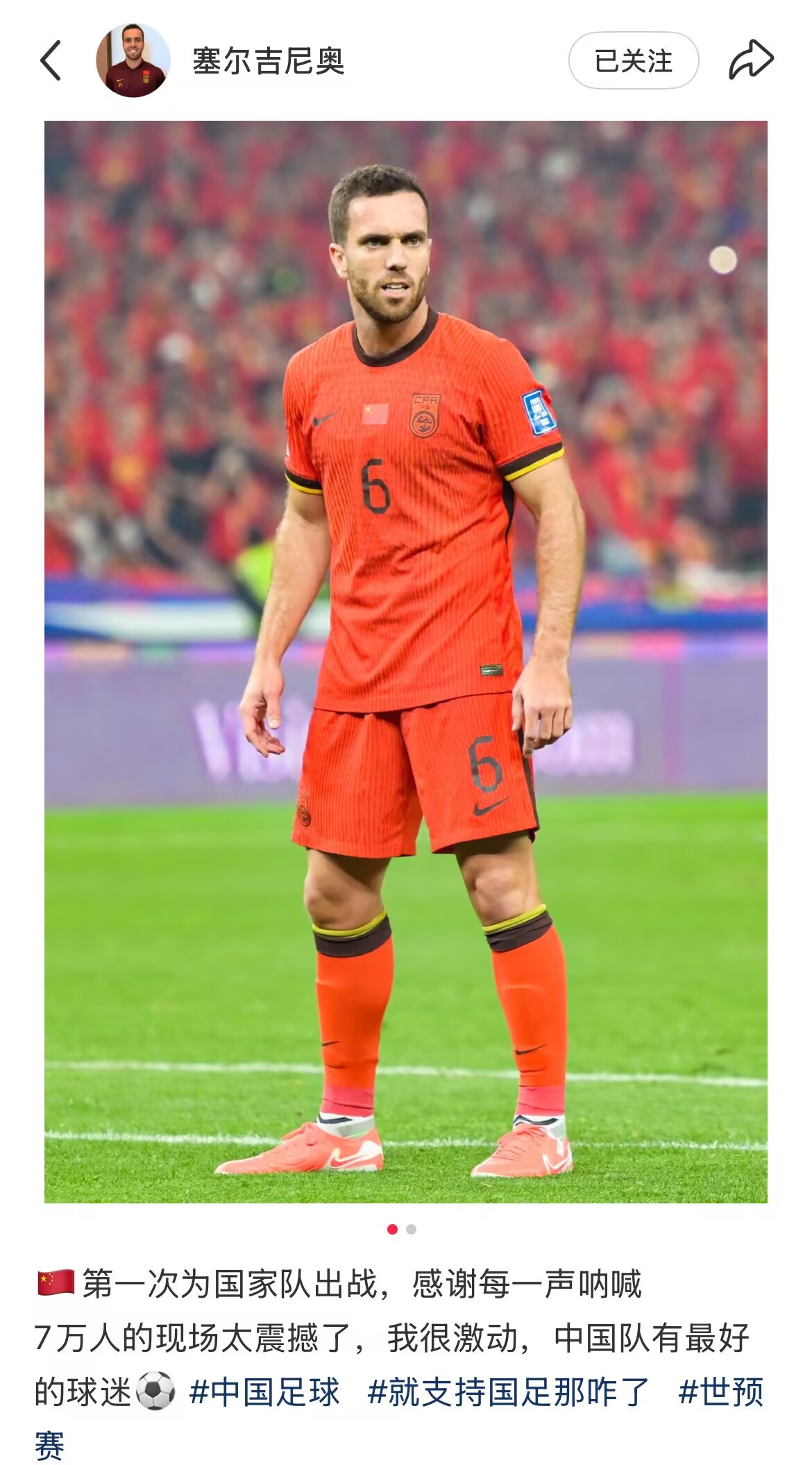 塞爾吉尼奧:“第一次為國(guó)家隊(duì)出戰(zhàn),感謝每一聲吶喊。7萬(wàn)人的現(xiàn)場(chǎng)太震撼了,我很激動(dòng),中國(guó)隊(duì)有最好的球迷?!?/p>