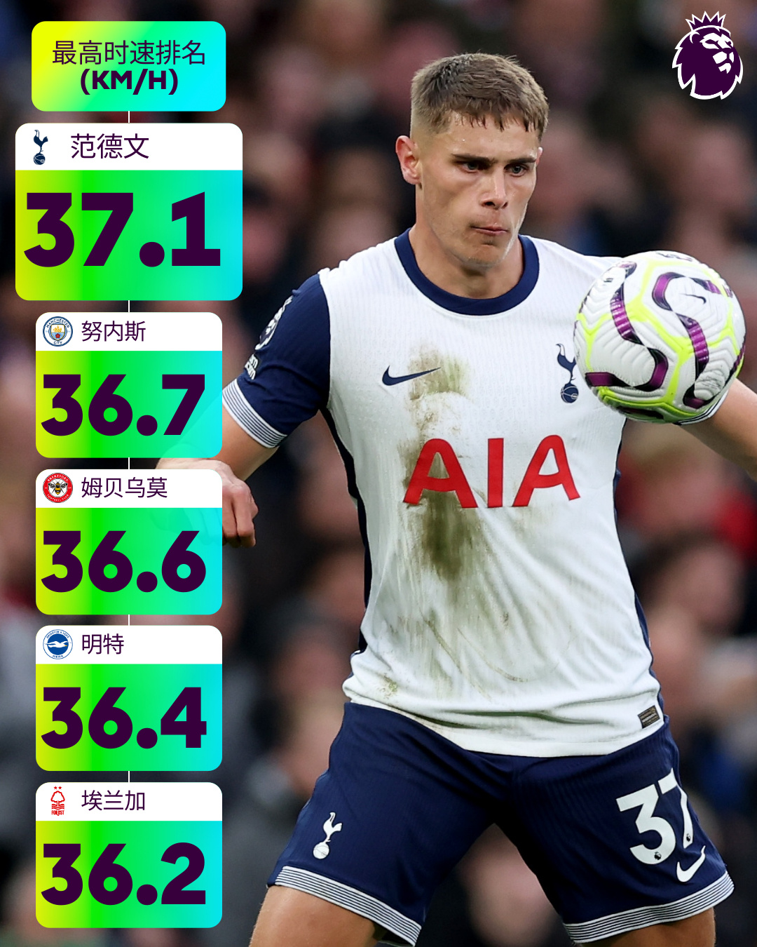 本賽季英超至今球員最高時速:范德文領跑,努內(nèi)斯、姆貝莫二三