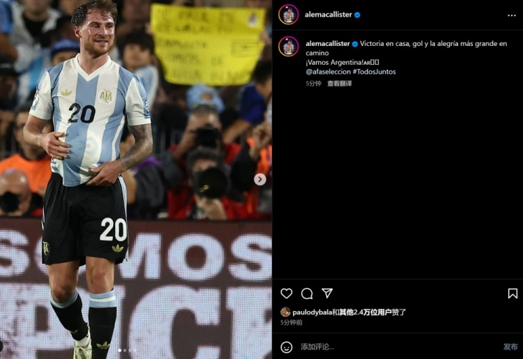 3月26日訊 南美區(qū)世預(yù)賽本輪比賽中,阿根廷主場4-1大勝宿敵巴西。賽后,麥卡利斯特更新社媒,慶祝獲勝。