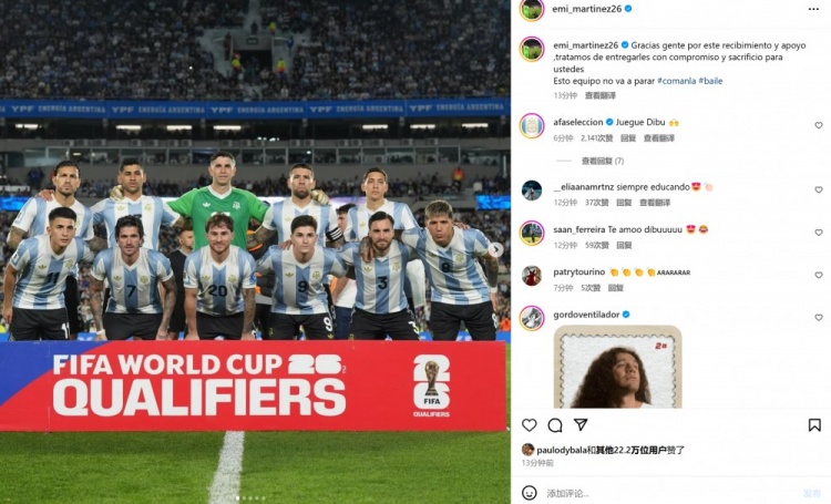 阿根廷門將馬丁內(nèi)斯也在社媒曬出本場球隊首發(fā)合影,配文寫道:“感謝大家的熱情支持,我們在場上努力付出一切,這支球隊永不會停下腳步!”