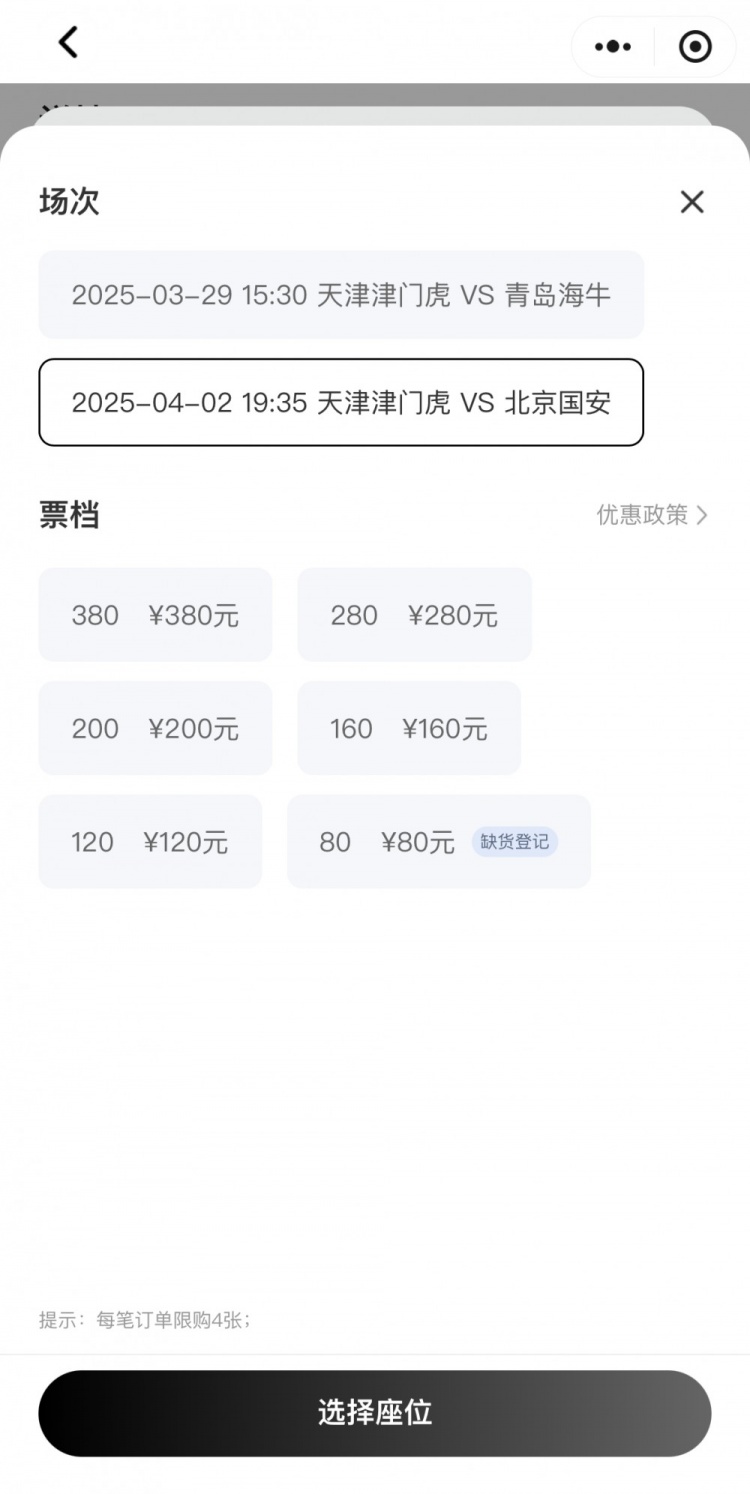 天津津門虎官方售票平臺信息顯示,本場比賽的門票開票后,僅有80元的最低價門票顯示缺貨,其他包括120元、160元、200元、280元、380元在內(nèi)的多個檔位仍有大量余票可供購買。