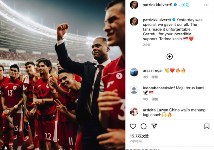 今日克魯伊維特更新社媒,曬出了全隊(duì)圍在一起慶祝勝利的照片,并配文寫道:“昨天是特別的一天,我們在場上傾盡所有,球迷們的加油助威讓這晚更加難忘。謝謝你們令人振奮的支持,感謝(印尼語)?!?/p>