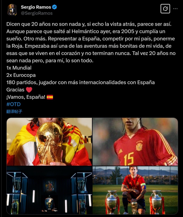 都說20年不算什么,當(dāng)我回首往事時(shí),似乎確實(shí)如此。盡管感覺就像我昨天才踏上赫爾曼蒂科球場,但那其實(shí)是在2005年,那天我實(shí)現(xiàn)了夢想,即代表西班牙,為我的國家而戰(zhàn)!就這樣,我開啟了一段人生中最美好的經(jīng)歷之一,這段經(jīng)歷會刻在我心底、永遠(yuǎn)不會遺忘。也許這20年不算什么,但對我來說,這就是一切,它讓我獲得1次世界杯冠軍、2次歐洲杯冠軍,代表西班牙隊(duì)踢了180場比賽,成為為西班牙隊(duì)出場次數(shù)最多的球員!