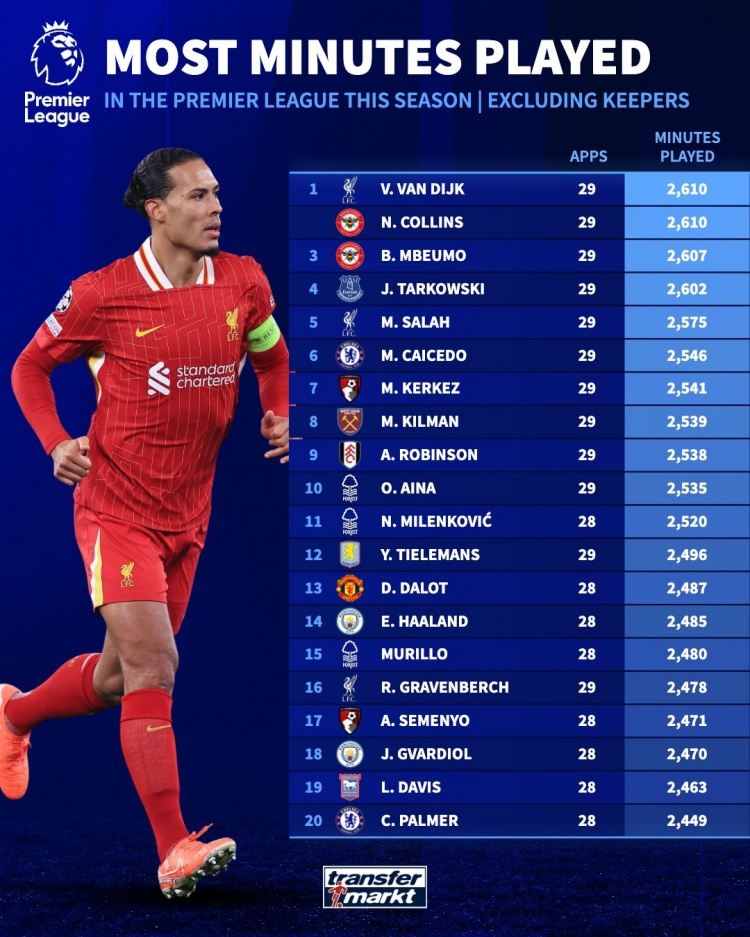 本賽季英超球員出場(chǎng)時(shí)間排行榜↓(不統(tǒng)計(jì)門(mén)將)