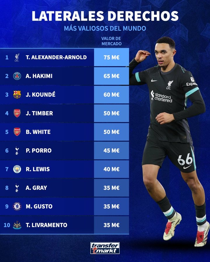 3月28日訊 媒體盛傳,阿諾德即將自由身轉(zhuǎn)會加盟皇馬。德國轉(zhuǎn)會市場今日列出右后衛(wèi)球員身價排名,阿諾德7500萬歐元第一。