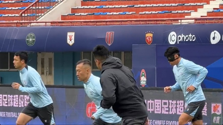 3月28日訊 申花今天進(jìn)行賽前踩場訓(xùn)練,中衛(wèi)朱辰杰戴面具參加。