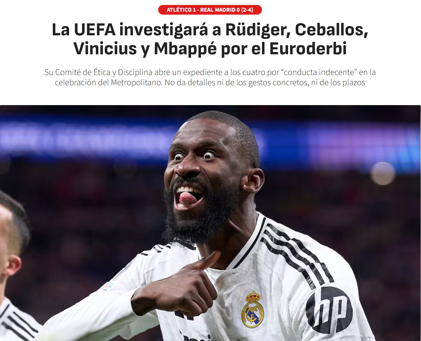 據(jù)此前報(bào)道,在皇馬vs馬競次回合比賽后,馬競方面向歐足聯(lián)提交了四段視頻,指控皇馬球員的不當(dāng)行為。其中包括:呂迪格對(duì)馬競球迷做出抹脖子手勢、維尼修斯多次挑釁觀眾、塞巴略斯進(jìn)入球員通道時(shí)做出粗魯手勢,以及姆巴佩面對(duì)馬競球迷觸摸自己隱私部位。