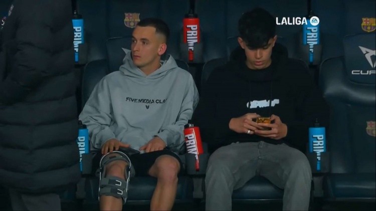 巴薩中場卡薩多本月被確認右膝外側韌帶部分撕裂,接受保守治療,預計將傷缺兩個月,他與另一位傷員伯納爾現(xiàn)場觀看了這場比賽,卡薩多更換發(fā)型、佩戴護具觀賽。