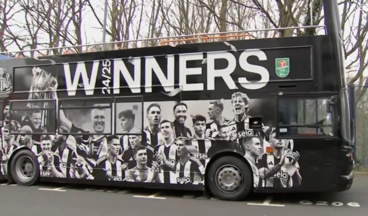 3月29日訊 紐卡斯?fàn)柦裉鞂⑦M行聯(lián)賽杯奪冠游行慶祝,現(xiàn)在教練和球員們將乘坐的大巴已經(jīng)亮相。