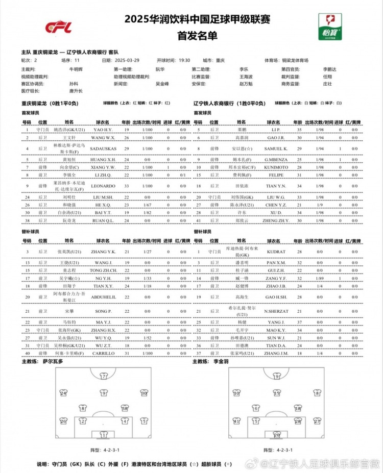 3月29日訊 今晚19:30,中甲第2輪迎來一場焦點(diǎn)戰(zhàn),重慶銅梁龍主場對陣遼寧鐵人,賽前雙方首發(fā)陣容公布。