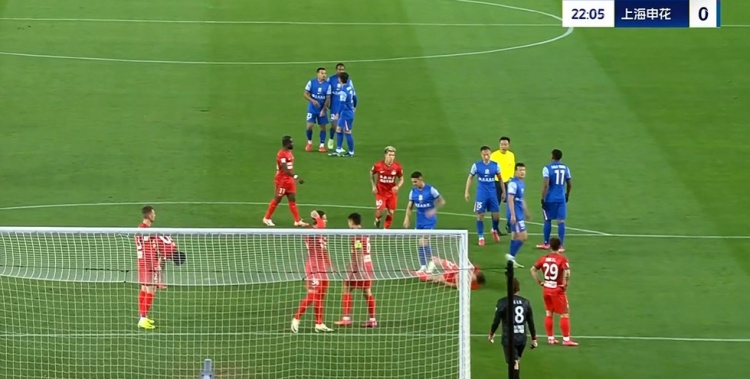 第23分鐘,申花左側(cè)角球機(jī)會(huì),禁區(qū)內(nèi)卡位時(shí)路易斯故意推搡黃銳烽,后者倒地,主裁黃牌警告路易斯↓