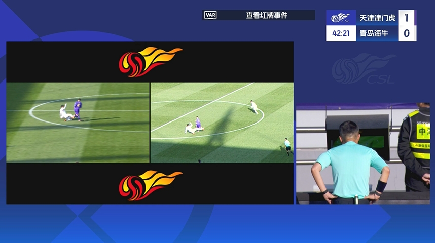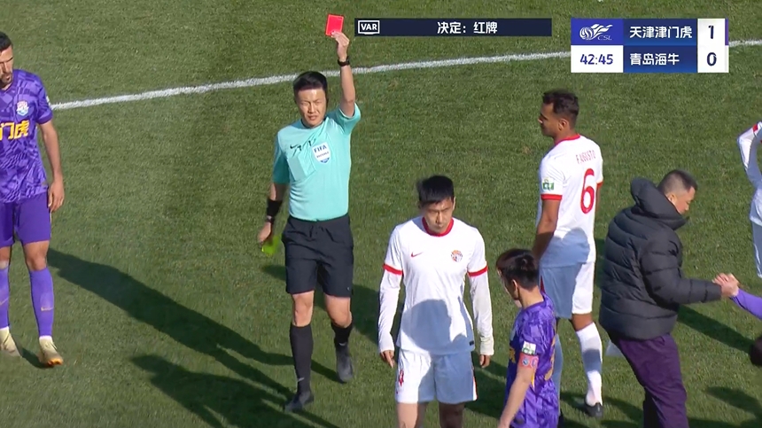 03月29日訊 中超第三輪,津門虎vs海牛。第42分鐘,海牛后衛(wèi)金洋洋飛鏟哈達斯,主裁起初出示黃牌,VAR介入后主裁改判紅牌將其罰下!