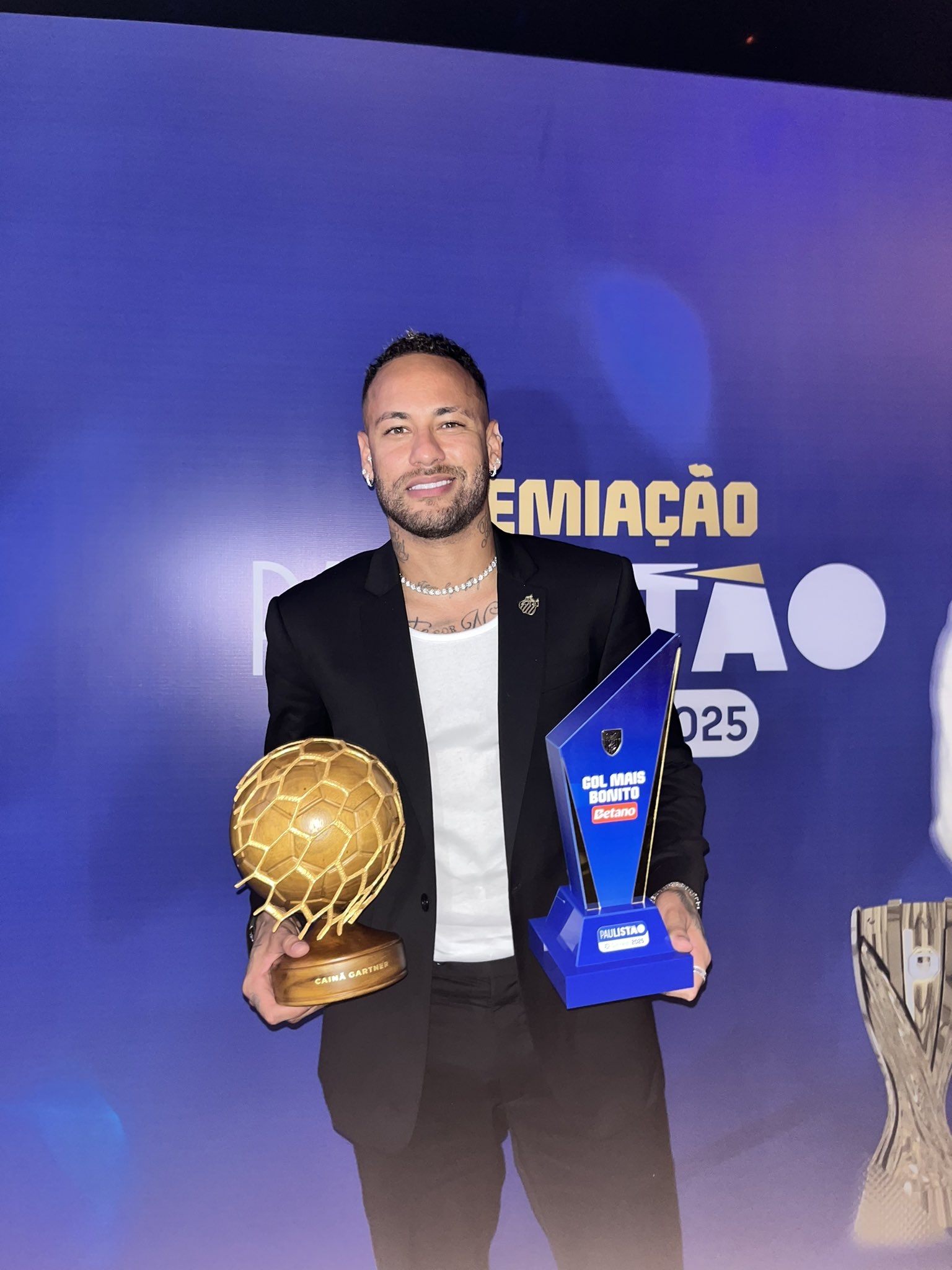 3月29日訊 內(nèi)馬爾日前出席圣保羅州聯(lián)賽頒獎(jiǎng)典禮,他對國際里梅拉的角球直接破門獲得了最佳進(jìn)球。
