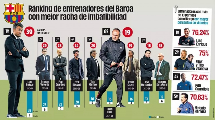 巴薩隊(duì)史主帥連續(xù)不敗場次排行榜: