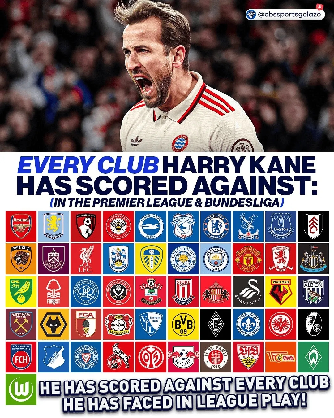 據(jù)媒體數(shù)據(jù)統(tǒng)計,此役過后,凱恩生涯在德甲、英超面對過51家俱樂部,而且全場完成破門得分!